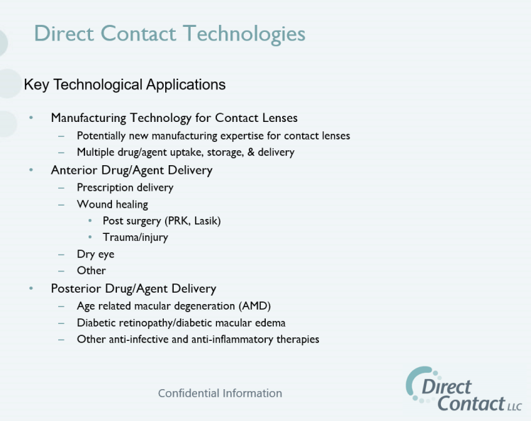 The Licensing entity is Direct Contact LLC. We are also open to Research and Development partnering agreements that co-develop proprietary molecules in this novel, patented drug delivery system.